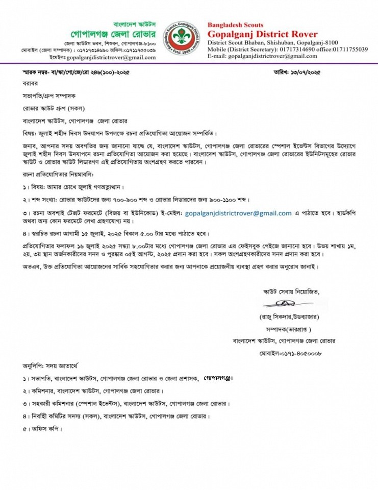 বিষয়: জুলাই শহীদ দিবস উদযাপন উপলক্ষে রচনা প্রতিযোগিতা আয়োজন সম্পর্কিত।