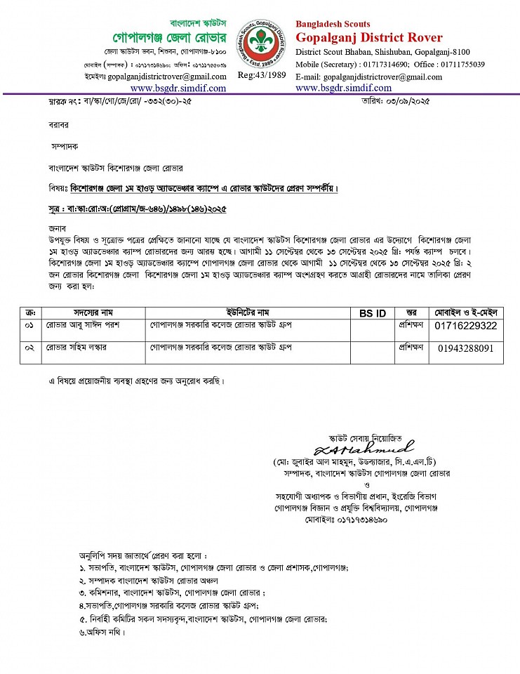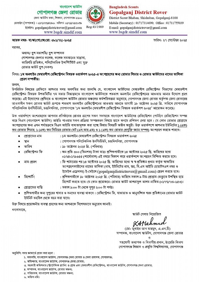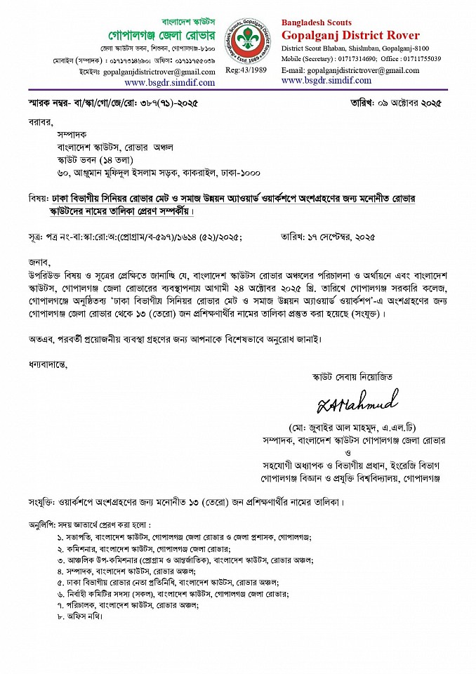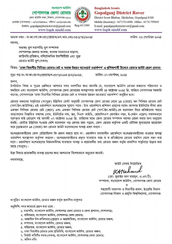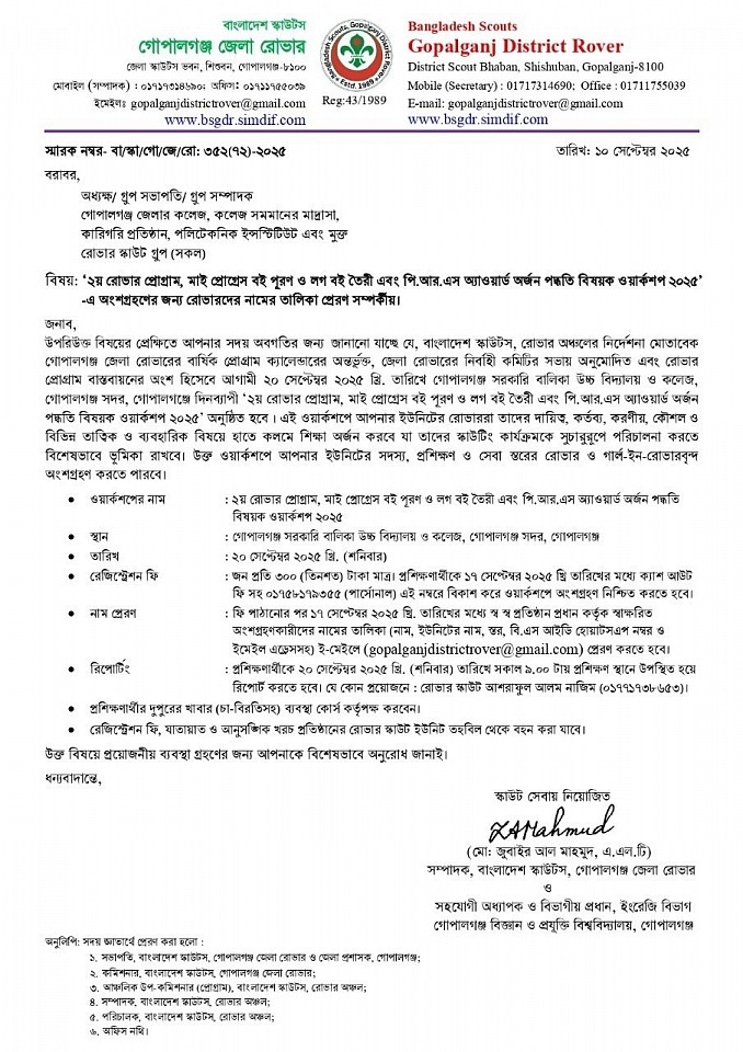 '২য় রোভার প্রোগ্রাম, মাই প্রোগ্রেস বই পূরণ ও লগ বই তৈরী এবং পি.আর.এস অ্যাওয়ার্ড অর্জন পদ্ধতি বিষয়ক ওয়ার্কশপ ২০২৫' -এ অংশগ্রহণের জন্য রোভারদের নামের তালিকা প্রেরণ সম্পর্কীয়।