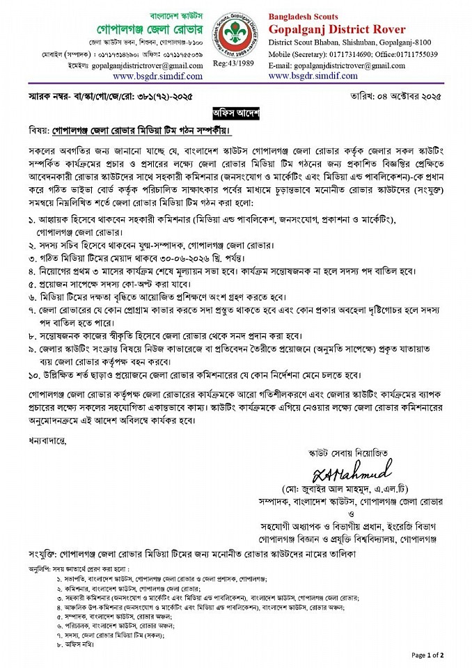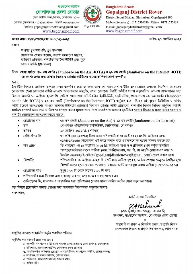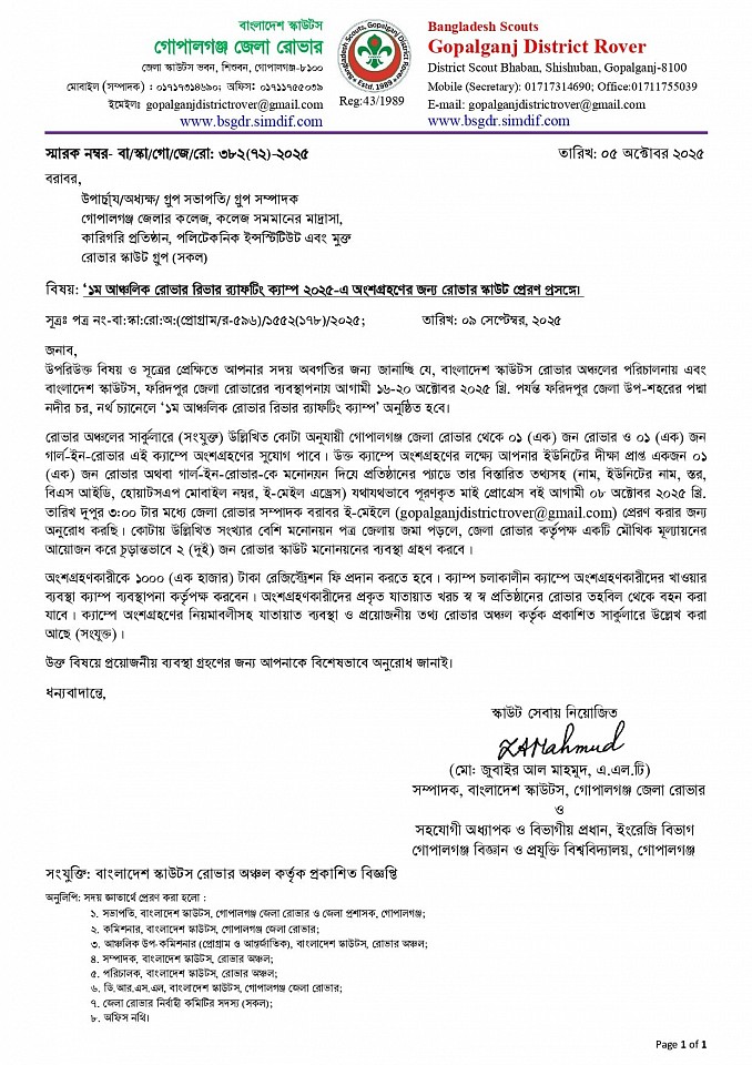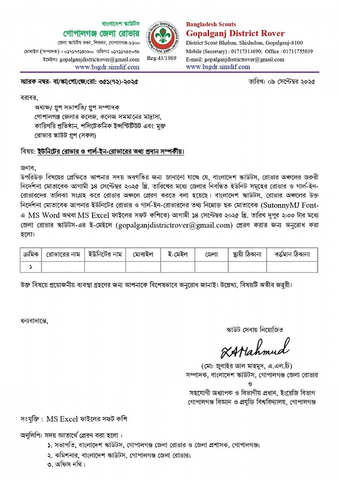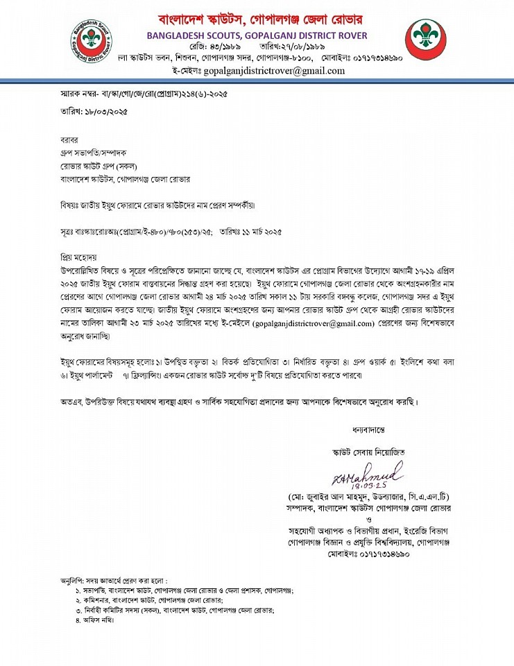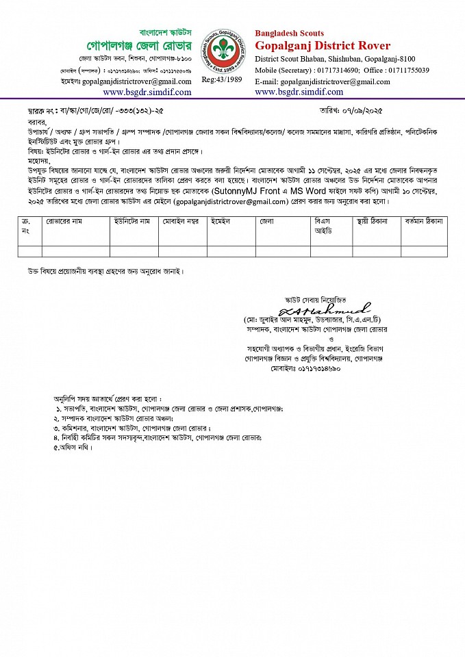'২য় রোভার প্রোগ্রাম, মাই প্রোগ্রেস বই পূরণ ও লগ বই তৈরী এবং পি.আর.এস অ্যাওয়ার্ড অর্জন পদ্ধতি বিষয়ক ওয়ার্কশপ ২০২৫' -এ অংশগ্রহণের জন্য রোভারদের নামের তালিকা প্রেরণ সম্পর্কীয়।