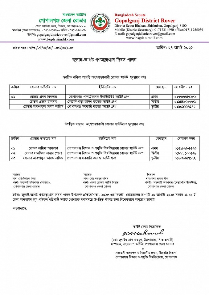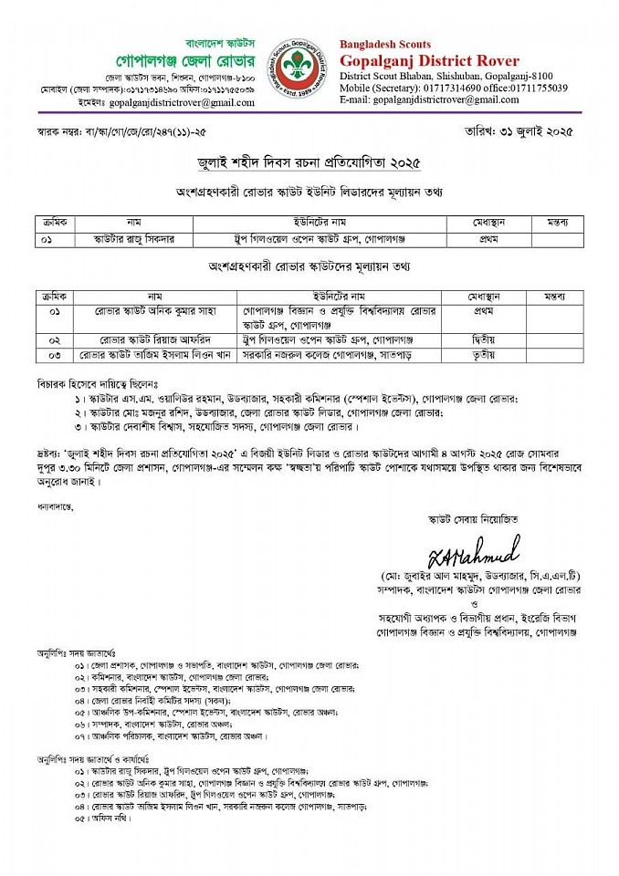 জুলাই শহীদ রচনা প্রতিযোগিতা -২০২৫ এর ফলাফল।