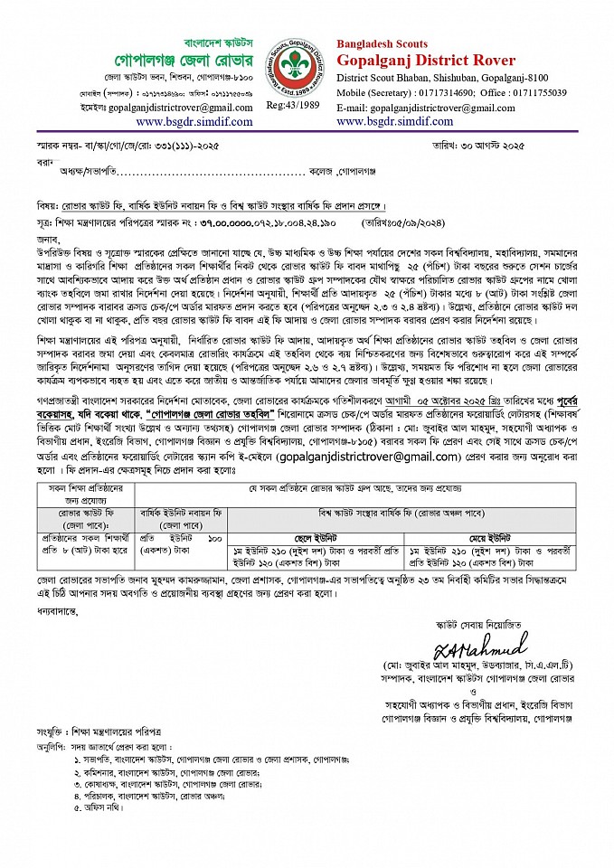 রোভার স্কাউট ফি, বার্ষিক ইউনিট নবায়ন ফি ও বিশ্ব স্কাউট সংস্থার বার্ষিক ফি প্রদান প্রসঙ্গে।