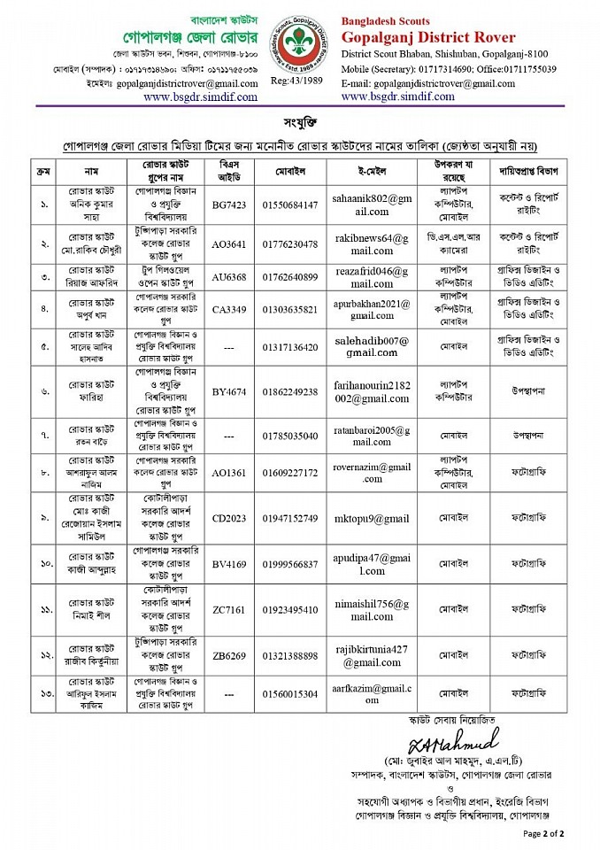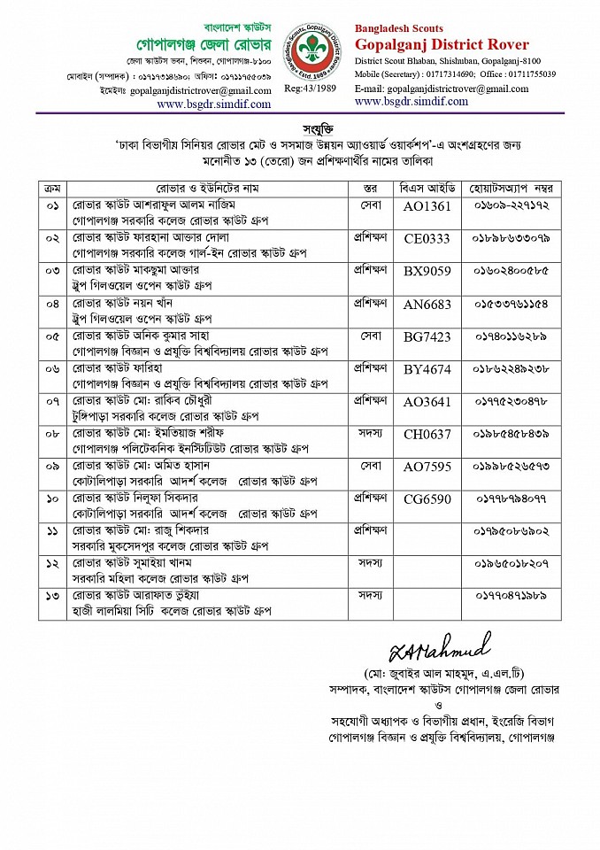 রোভার স্কাউট ইউনিট লিডার অ্যাডভান্সড কোর্সে অংশগ্রহণের জন্য রোভার লিডারদের নামের তালিকা প্রেরণ সম্পর্কীয়।