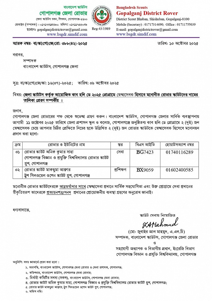 জেলা স্কাউটস কর্তৃক আয়োজিত কাব হলি ডে ২০২৫ প্রোগ্রামে স্বেচ্ছাসেবক হিসাবে মনোনীত রোভার স্কাউটদের নামের তালিকা প্রেরণ সম্পর্কীয় ।
